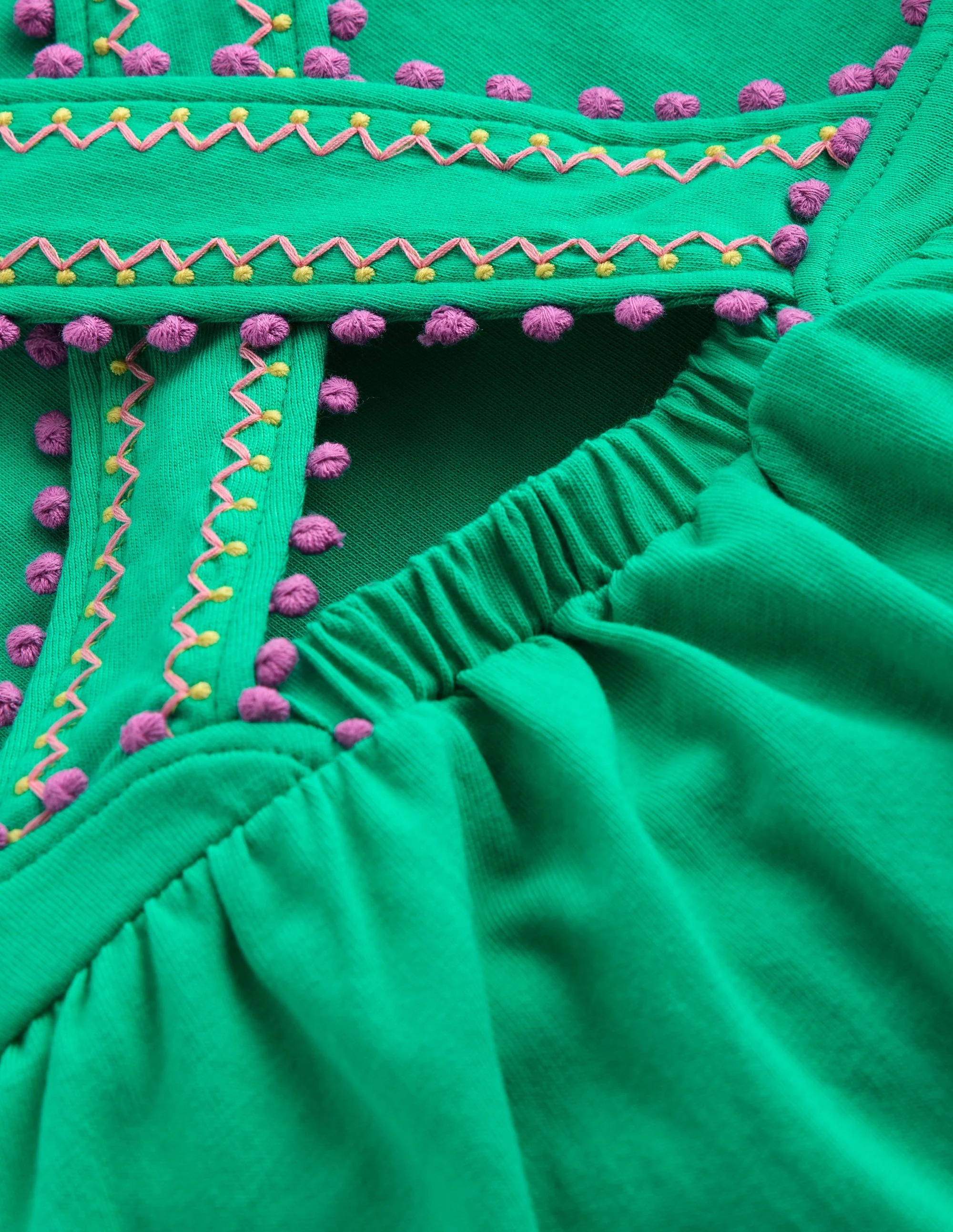 This soft cotton top has comfy cross-back straps decorated with colourful stitches and pom trim. The gentle gathers give it a floaty, relaxed shape perfect for warmer days.